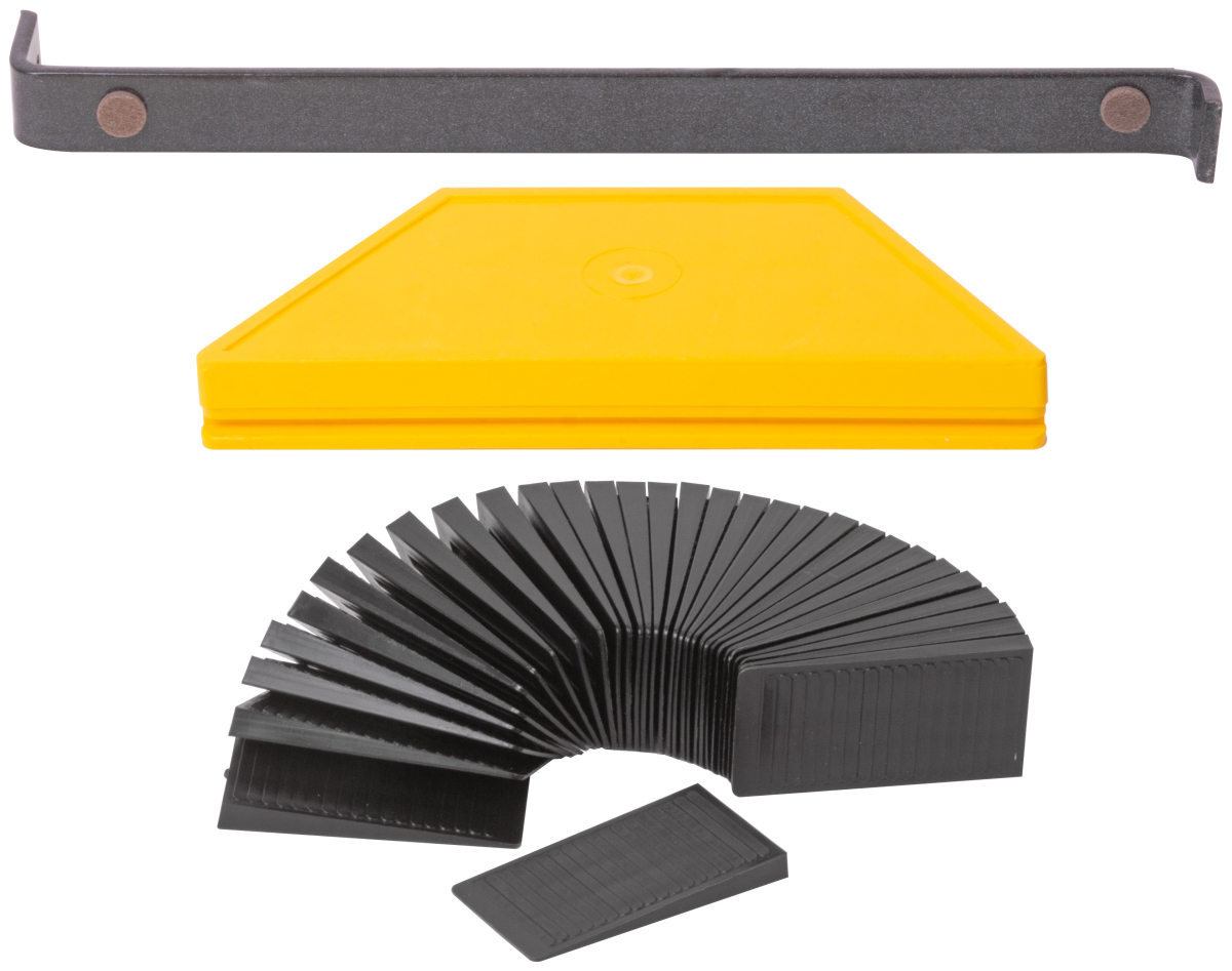 В наборе: пластиковый брусок, монтажная скоба, пластиковые клинья (30 шт.). Регулировка расстояния между ламинатными панелями и стеной с помощью пластиковых клиньев, возможность работы в ограниченном пространстве. Материал: инструментальная сталь, пластик. Упаковка: п/э пакет с подвесом.